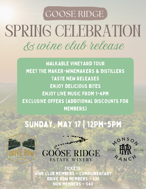 Tickets are $50 for non-club members and $45 for our valued wine and cider club members. Our full Goose Ridge wine, Drive Row hard cider, and Monson Ranch Distillers spirits menu will also be available for purchase.